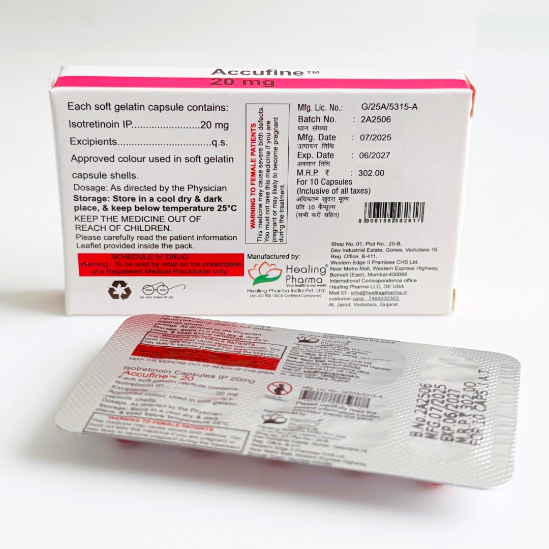 У нашому інтернет-магазині ми пропонуємо купити Ізотретиноїн Accufine індійської фармакологічної компанії Healing Pharma. Це оригінальний продукт, який виготовляється за сучасними стандартами в галузі фармації. У нас — оптимальні ціни та доставка по Україні.