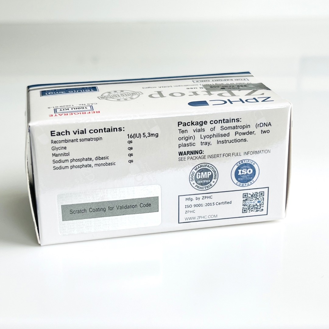 Придбати препарат ZPtropin 16МЕ в Україні! ZPtropin 16МЕ - це синтетичний гормон росту, вироблений у лабораторних умовах з використанням методів генної інженерії. Його форма - білий порошок, який після розведення розчином новокаїну готовий до вживання. Цей препарат є унікальним, хоча й має високу вартість. Правильне використання і дозування ZPtropin можуть принести чудові результати і виправдати вкладення в нього. Купити його за найвигіднішою і найпривабливішою ціною 9500 грн. можна в нашому інтернет магазині myprotein.kiev.ua.